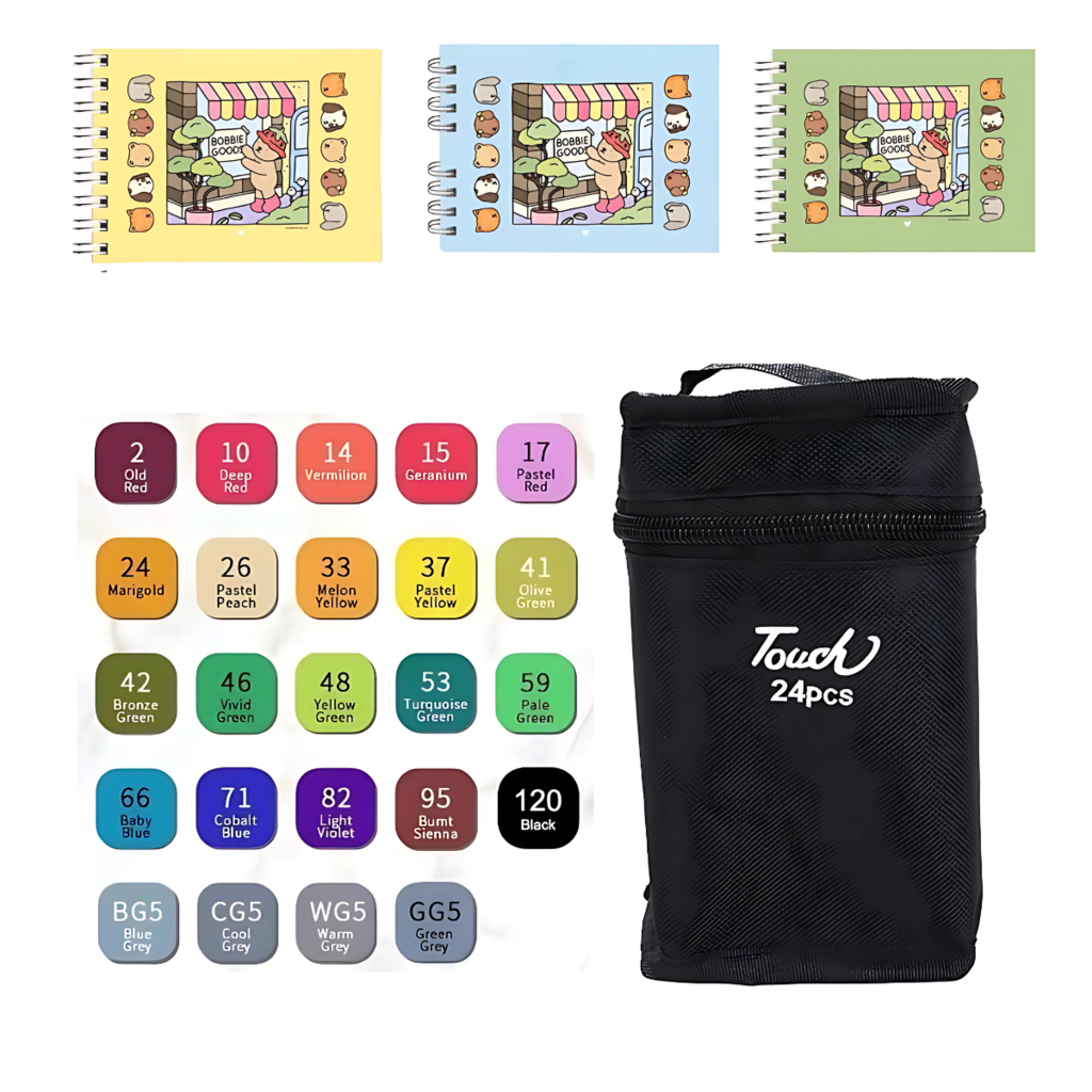 3 Livros Bobbie Goods 100 Folhas + Caneta Marcadores com Ponta Dupla 24 Cores