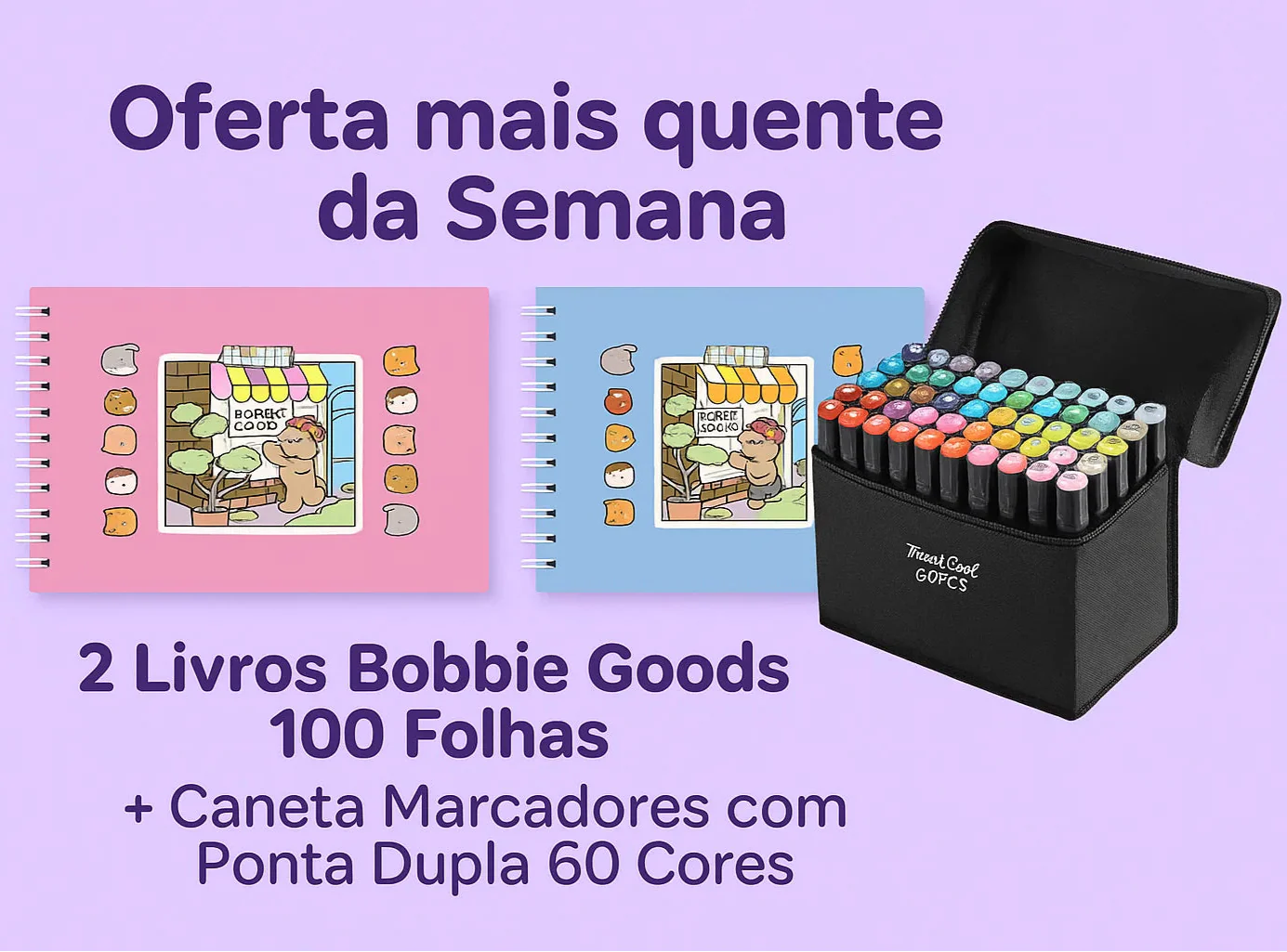 2 Livros Bobbie Goods 100 Folhas + Caneta Marcadores com Ponta Dupla 60 Cores